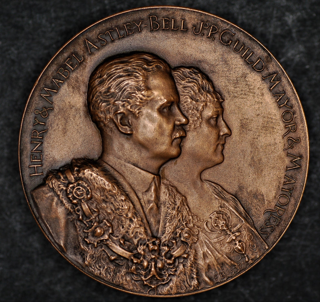 Obverse The obverse shows conjoined portraits of the Mayor & Mayoress of Preston. HENRY & MABEL ASTLEY-BELL J.P GUILD MAYOR & MAYORESS