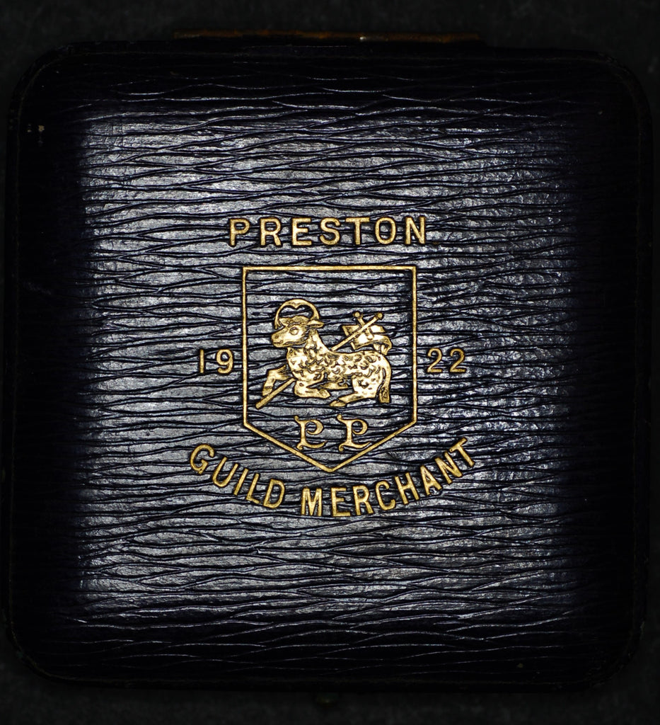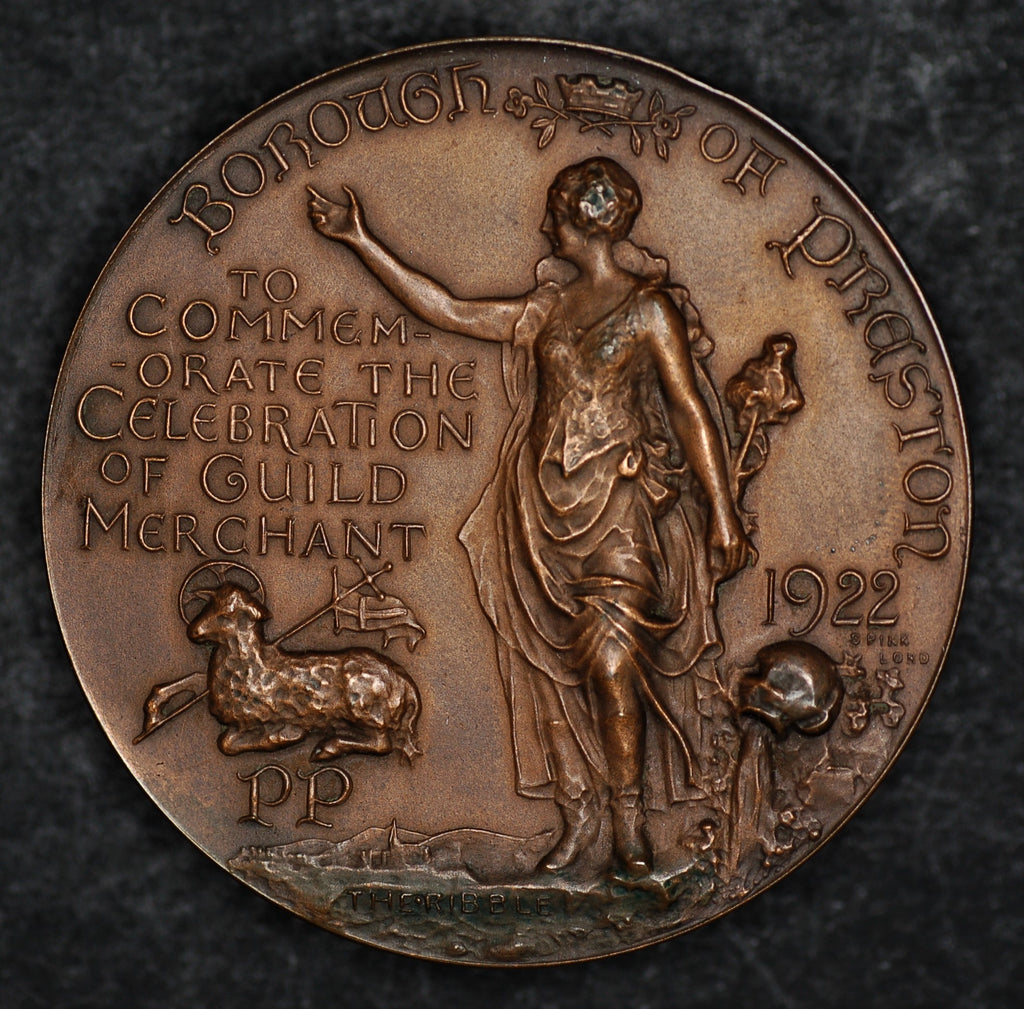 Reverse The reverse shows the Paschal Lamb with cross staff and initial PP. There is also "The Ribble" at the bottom of the medallion and "Spink Lon" below the date 1922. BOROOUGH OF PRESTON TO COMMEMORATE HE CELEBRATION OF GUILD MERCHANT 1922