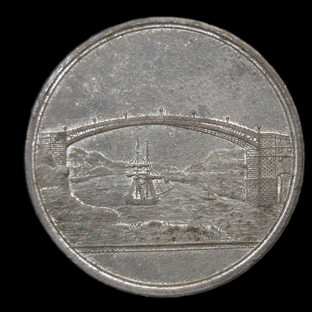 The "Sunderland Bridge Lottery" medal from 1816 was a commemorative medal issued for a lottery to fund the construction of the Sunderland Bridge. The medal, designed by T. Halliday, features a ship beneath the bridge on the obverse and has a legend on the reverse. It is made of white metal or pewter, weighs about 31.7 grams, and is around 45mm in diameter.