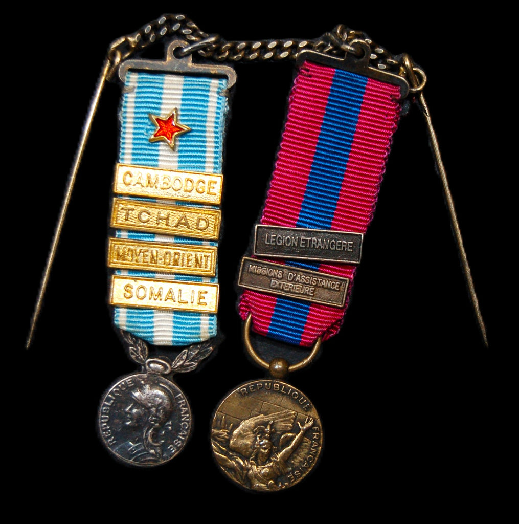 National Defence Medal, 2nd Type, 2 clasps, Missions d'Assistance Exterieure, Legion Etrangere, mounted continental-style as worn upon chain with pins at either end. Extremely fine.