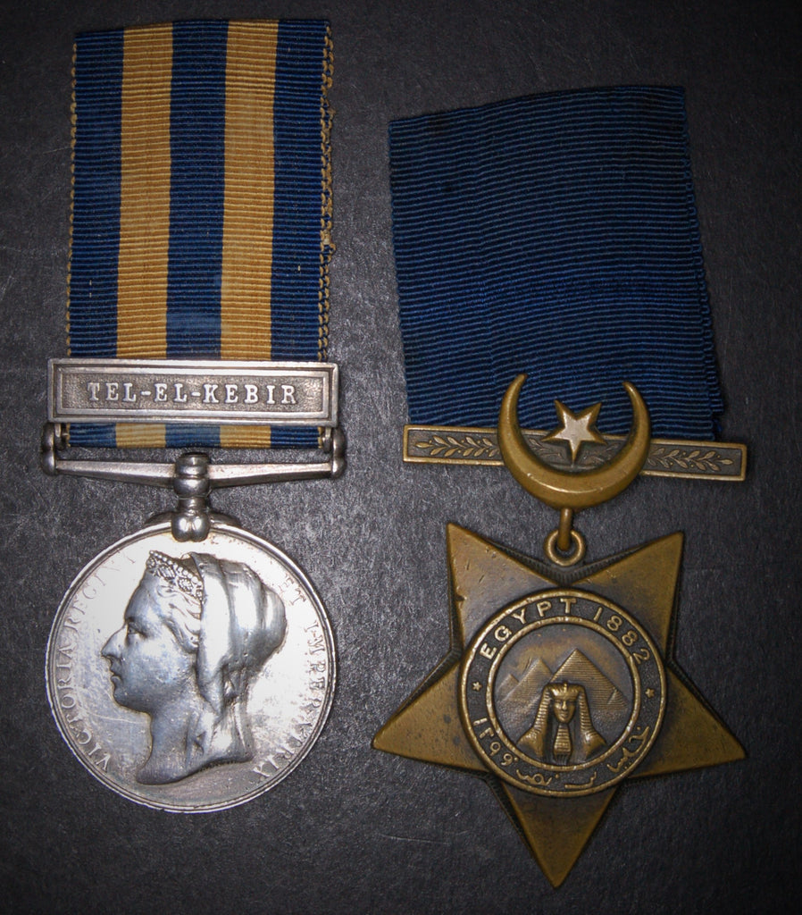 Egypt 1882-89, dated reverse, 1 clasp, Tel-El-Kebir (Engraved 2655 Pte Evan Mills. 2/Y & L. Regt.), Khedive's Star 1882, No 2665 Pte E Mills, engraved to the reverse, the first good fine, the second very fine. Pte E Mills appears on the medal rolls for this campaign. Interestingly an Evan Mills of this regiment and battalion (no number to confirm, see attached document) attended a disciplinary action at The Curragh on 25th August 1881.
