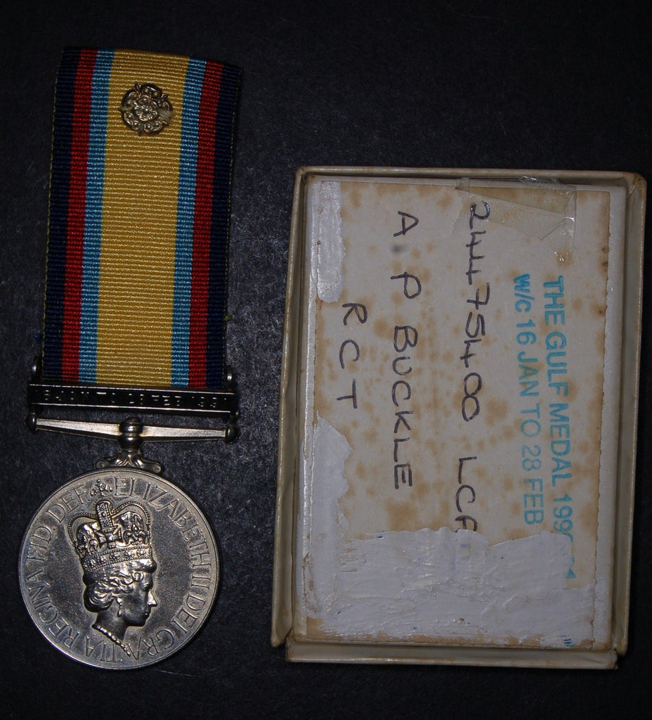The Gulf medal is correctly impressed 24475400 L CPL A P BUCKLE RCT.
