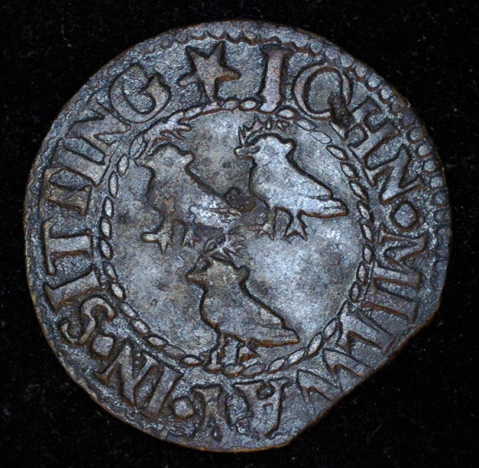 Kent, Sittingbourne Token, John Milway, Farthing, undated, JOHN MILWAY IN SITTING, three doves, rev. BOURNE NEXT THE CROWN initials within, 1.11g (BW 524; dies as Norweb 2744), chipped and with lightly pitted surfaces, otherwise near very fine
