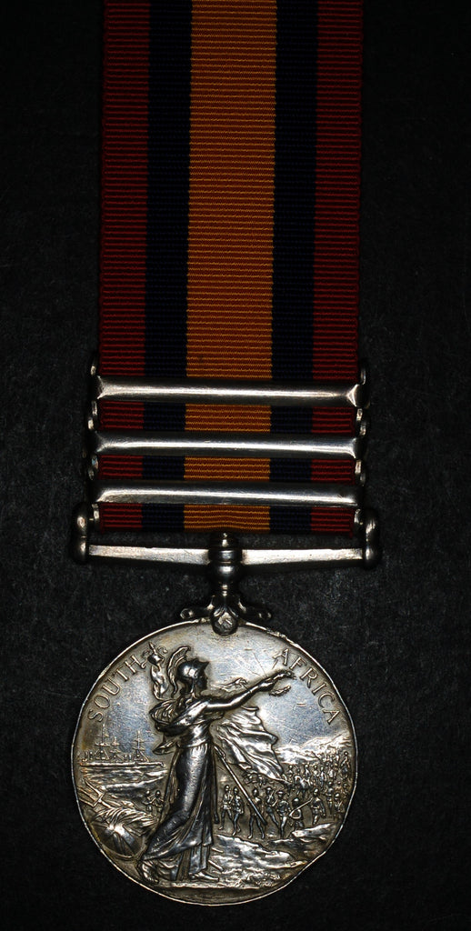 The good news is that it is correctly impressed to 3648 Pte J. WRIGHT. NOTTS & DERBY REGt. The obverse shows signs of brooch mounting at some point, quite nicely removed. The suspension and clasps are original but not for this medal, and are slightly loose around the mounting pin. Fitted are WITTEBERGEN, TRANSVAAL, CAPE COLONY.