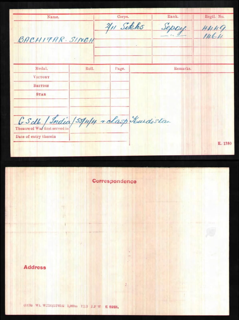 Bachitar Singhs award is confirmed. The suspension of this medal has been either reinforced or reaffixed with adhesive, and although solid, would benefit from a professional repair.