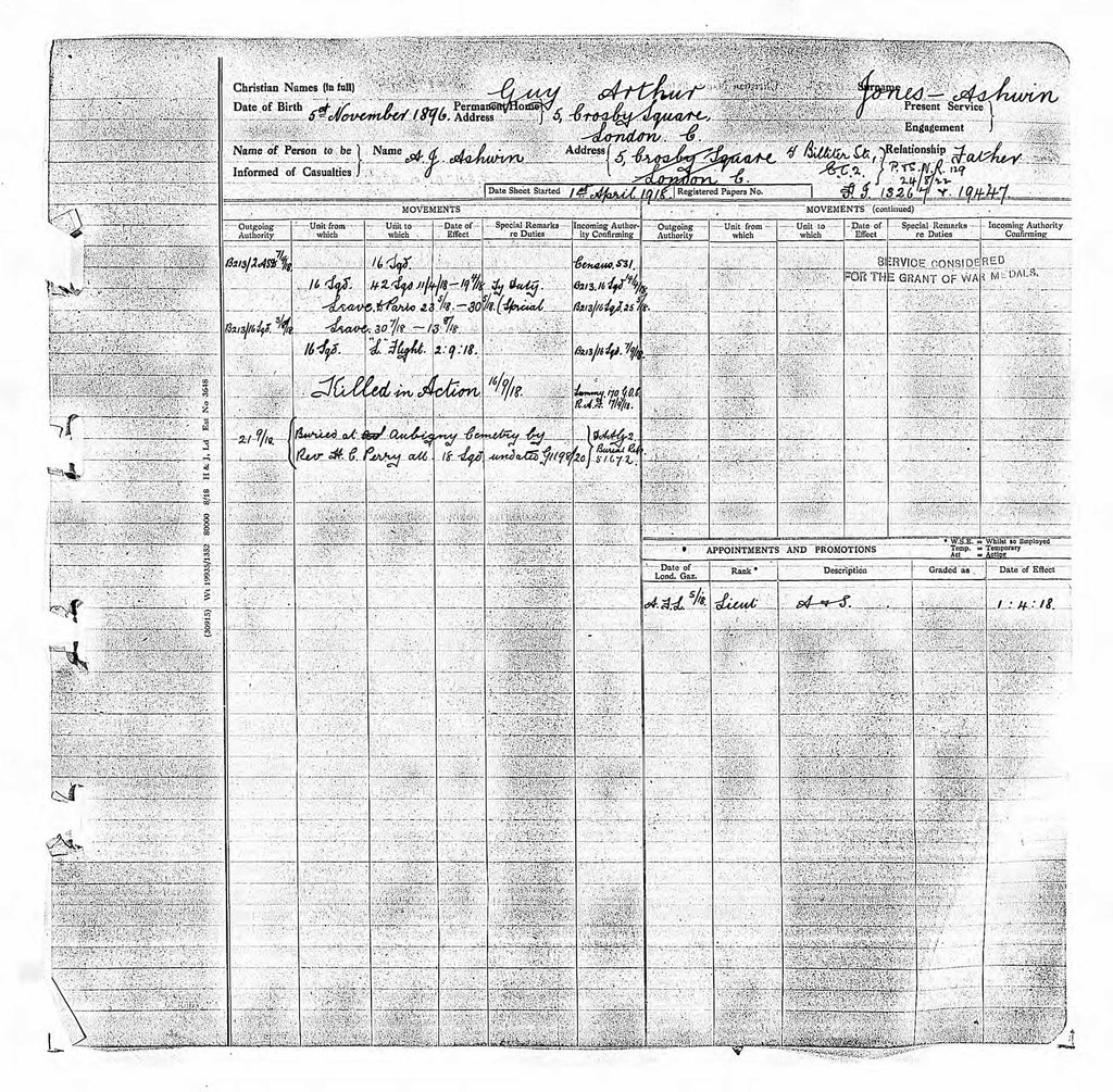 Guy Arthur Jones Ashwin was the only (Step)son of Albert John Ashwin of London and a native of Kent.